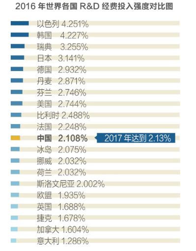 2016年已经达到了2.108%,超过了英国,意大利,加拿大,挪威,荷兰这样的发达国家,也超过了欧盟1.935%的平均水平,而2017年进一步达到了2.13%的水平,也就是还在不断提升。
