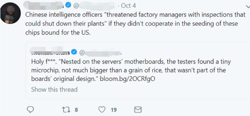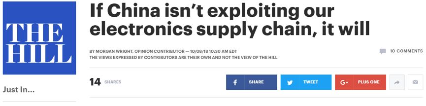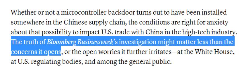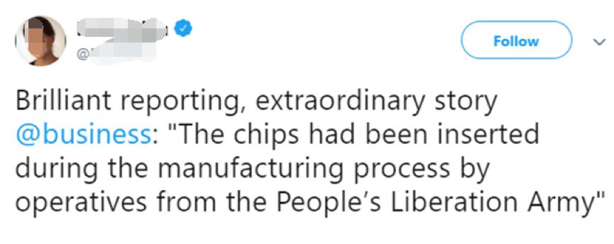 “因为彭博社的报道揭示了一个危机”,美国的《大西洋月刊》一篇文章这样说到。什么“危机”呢?美国《国会山报》在其网站上刊登的另一篇持同样观点的文章,则已经在标题中说明了:“哪怕中国现在没有在侵害我们的电子产品【供应链】,他们迟早也会”。