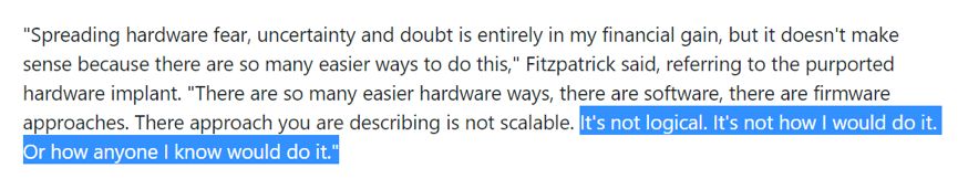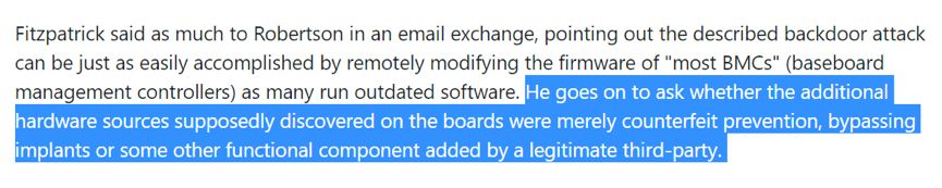 此后,一位彭博社报道中提到的硬件安全专家,也公开站出来开始质疑彭博社的报道了!