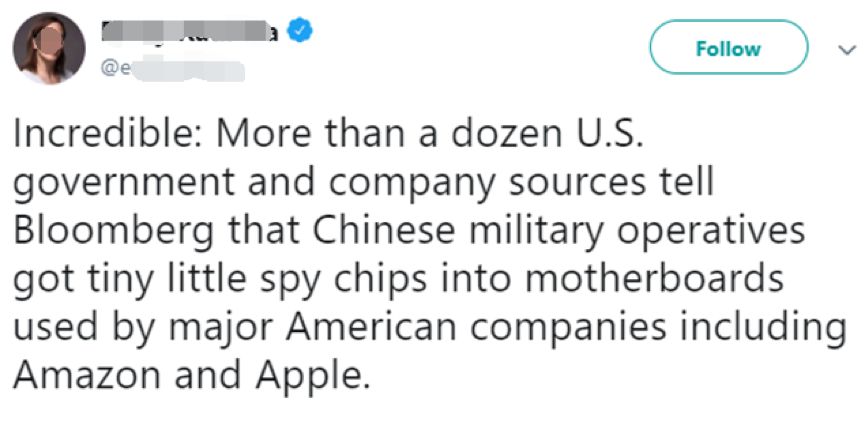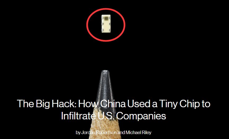 该报道宣称,中国解放军要求一家美国电脑硬件企业的中国工厂悄悄在他们生产的电脑服务器主板上植入一种只有米粒大小的“间谍芯片”,并通过这一“逆天黑科技”成功入侵了美国知名IT企业苹果和亚马逊的服务器。