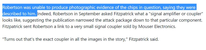 可菲茨帕特里克对此并不信服。他说罗伯特森其实并没见过所谓的“间谍芯片”的实际图片证据,一切都只是听他的信源“描述”给他的。这也是为何罗伯特森会找菲茨帕特里克询问信号耦合器长啥样,并在报道中展示了与菲茨帕特里克提供的信号耦合器的图片一模一样的电子元件……