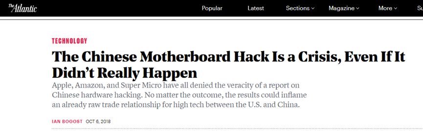 没错,《大西洋月刊》和《国会山报》的两篇文章都认为,即便中国没有通过硬件入侵美国企业是的服务器主板,彭博社的报道都暴露出了美国过于依赖中国的电子产品供应链条,给美国带来的巨大安全危机。