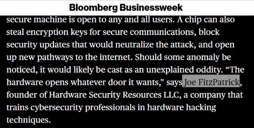 这位名叫菲茨帕特里克(Joe FitzPatrick)的硬件安全专家,也是彭博社那篇恶毒栽赃中国的报道中,仅有的几位被写明了姓名的受访者。