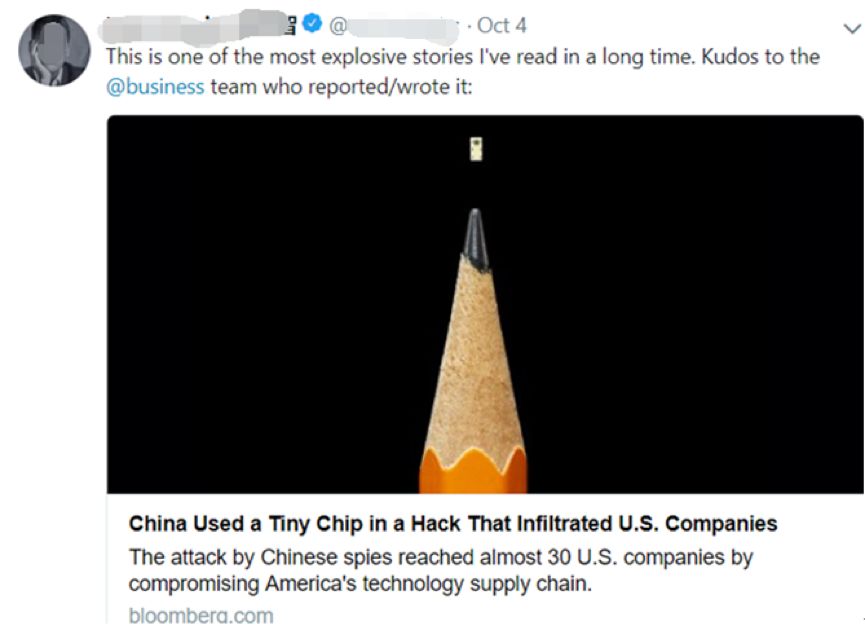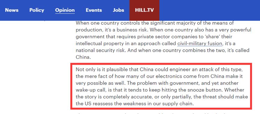 《国会山报》还进一步写到:“中国不仅看起来十分有可能进行这样的硬件入侵,而且我们大量的电子产品来自中国这一事实也同样令彭博社所披露的这种攻击极具可能性……所以不论这个报道是完全准确,或是部分准确,其所披露的来自中国的威胁都应该令美国好好评估我们供应链中的薄弱环节”。
