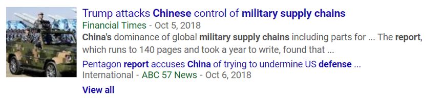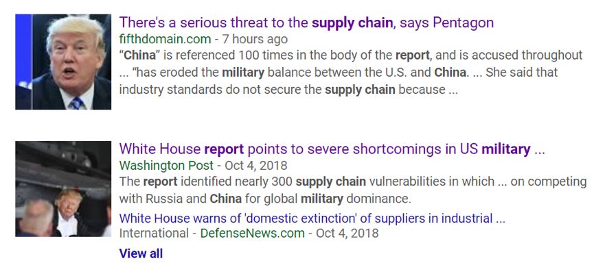 值得注意的是,这两家媒体刊登的观点,以及始作俑者的“彭博社”的那篇栽赃中国的报道,都与美国五角大楼最新发布的一份强烈渲染“中国威胁论”的报告形成了明显的“呼应”。这份报告的一个重点就是美国电子产品的供应链面临来自中国的“严重威胁”,而这也直接威胁着美国的国防和国家安全。