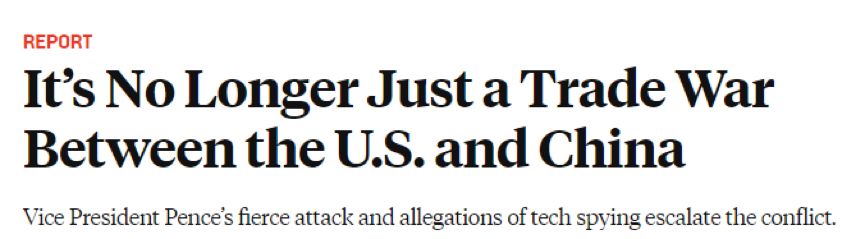更重要的是,美国副总统彭斯上周发表的那番对中国充满“攻击性”的演讲,也是发生在彭博社的报道与五角大楼的报告之间。