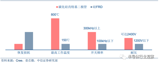 (1)碳化硅二极管: 损耗低耐温高,有望抢占硅快恢复二极管(FRD) 部分市场