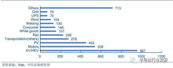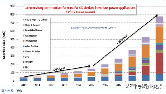 SiC 器件各应用领域十年期市场预测(单位:百万美元)
