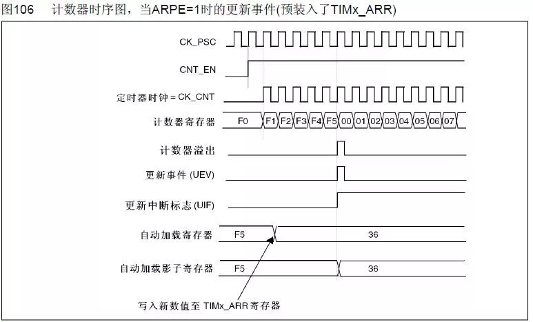 31、自动装载寄存器和影子寄存器:前者相当于51当中的溢出设定数值。而影子寄存器顾名思义是影子,就是寄存器的另一分copy。实际起作用的是影子寄存器,而程序员操纵的则是自动装载寄存器。如果APPE位使能,表明自动装载寄存器的值在下一次更新事件发生后才写入新值。否则,写入自动装载寄存器的值会被立即更新到影子寄存器。