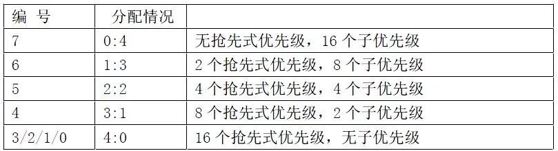 20、(NestedVectored Interrupt Controller)NVIC嵌套向量中断控制器,分为两种:抢先式优先级(可嵌套)和中断优先级(副优先级,不能嵌套)。两种优先级由4位二进制位决定。分配下来有十六种情况: